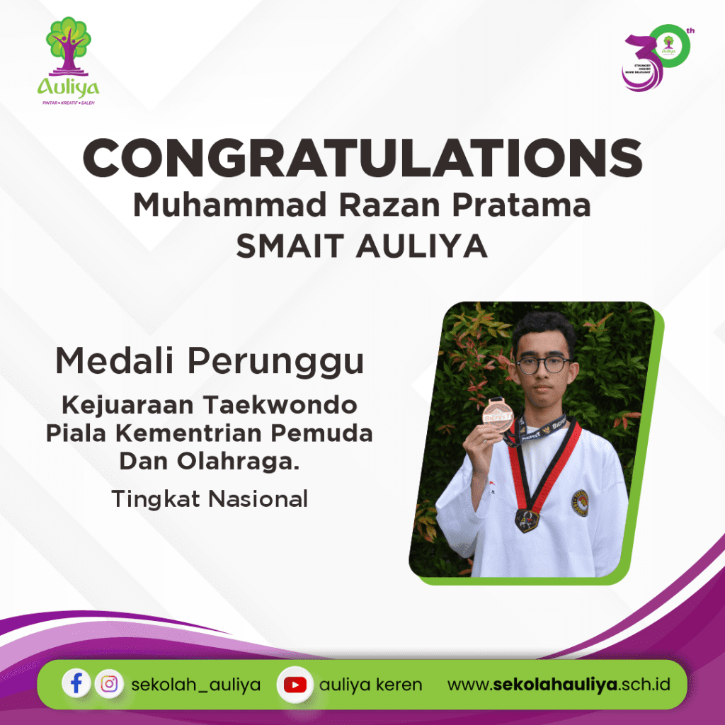 Selamat dan sukses kepada ananda Muhammad Razan Pratama, siswa kelas 11 SMAIT AULIYA, yang telah berhasil meraih medali perunggu dalam ajang Indonesia Bigfest Taekwondo Challenge Piala Kementrian Pemuda & Olahraga Tingkat Nasional