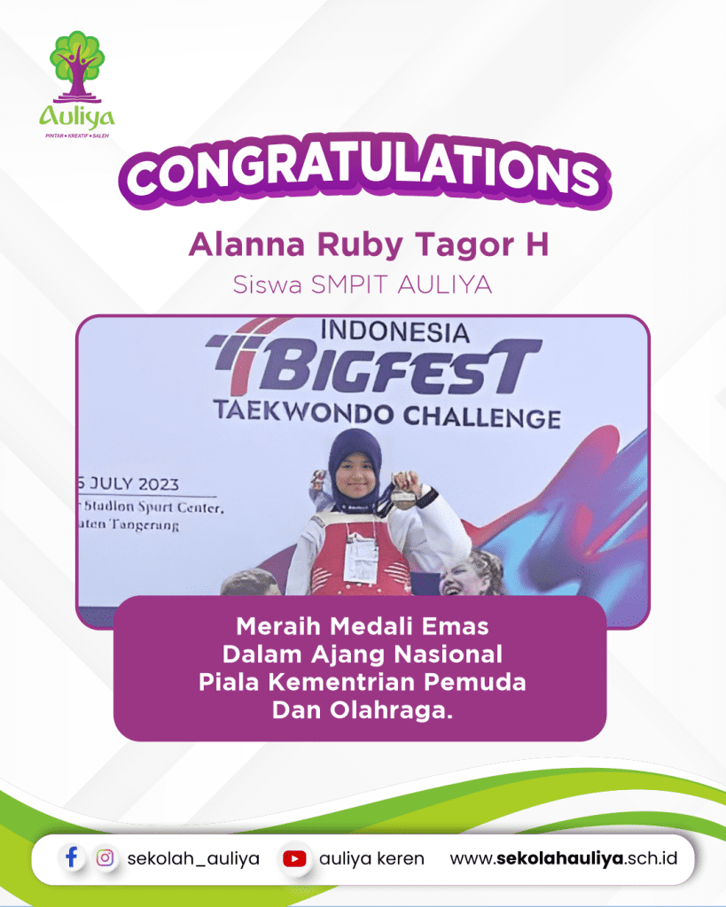Selamat dan sukses kepada ananda Alanna Ruby Tagor H, siswa kelas 8 Diponegoro SMPIT AULIYA, yang telah berhasil meraih medali emas dalam ajang Indonesia Bigfest Taekwondo Challenge Piala Kementrian Pemuda & Olahraga Tingkat Nasional